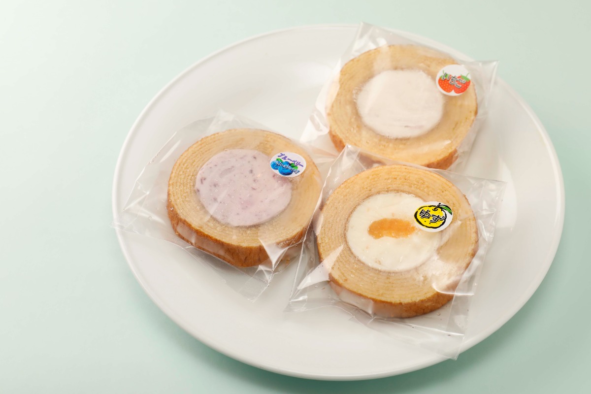 しっとりバウムクーヘン「姫ばうむ」の真ん中に、鬼北産の果物を使ったアイス。