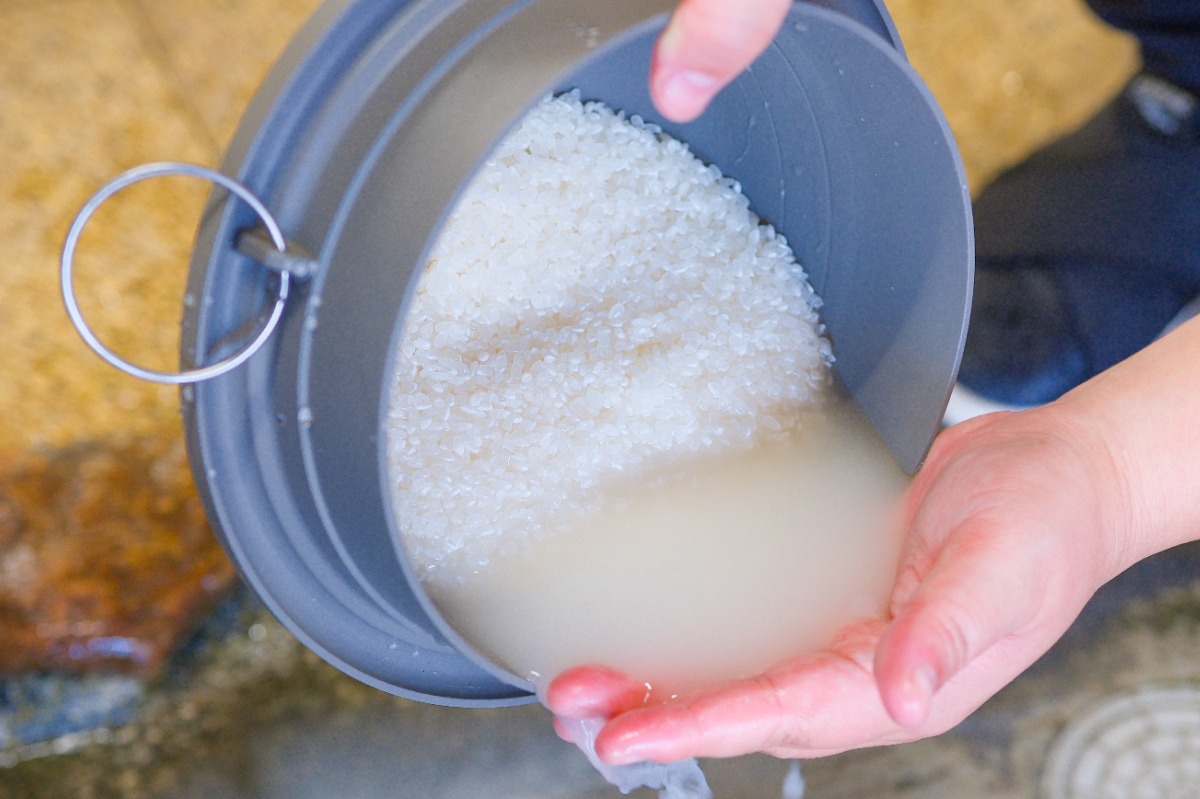 羽釜に “みま米” を入れて米を研ぐところから体験がはじまります。