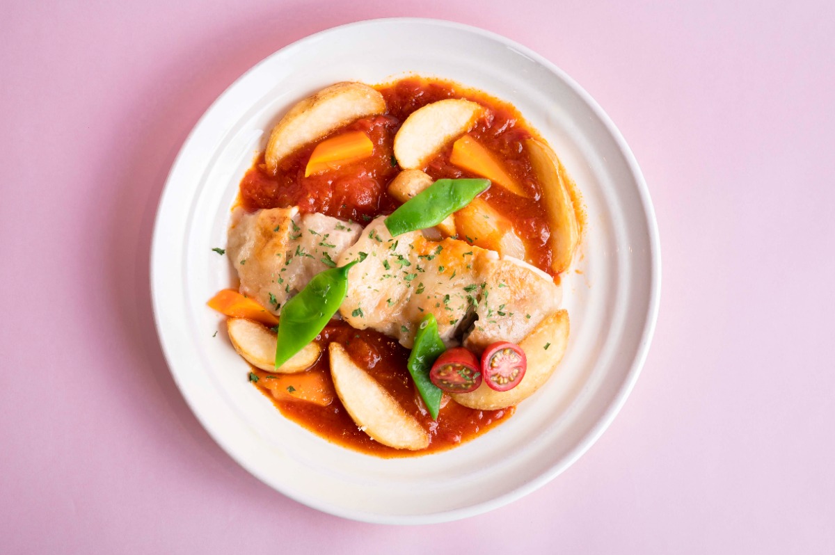 季節の野菜とガーリックを効かせて焼いた四万十鶏の一品。ソースにはトマトがたっぷりあります!