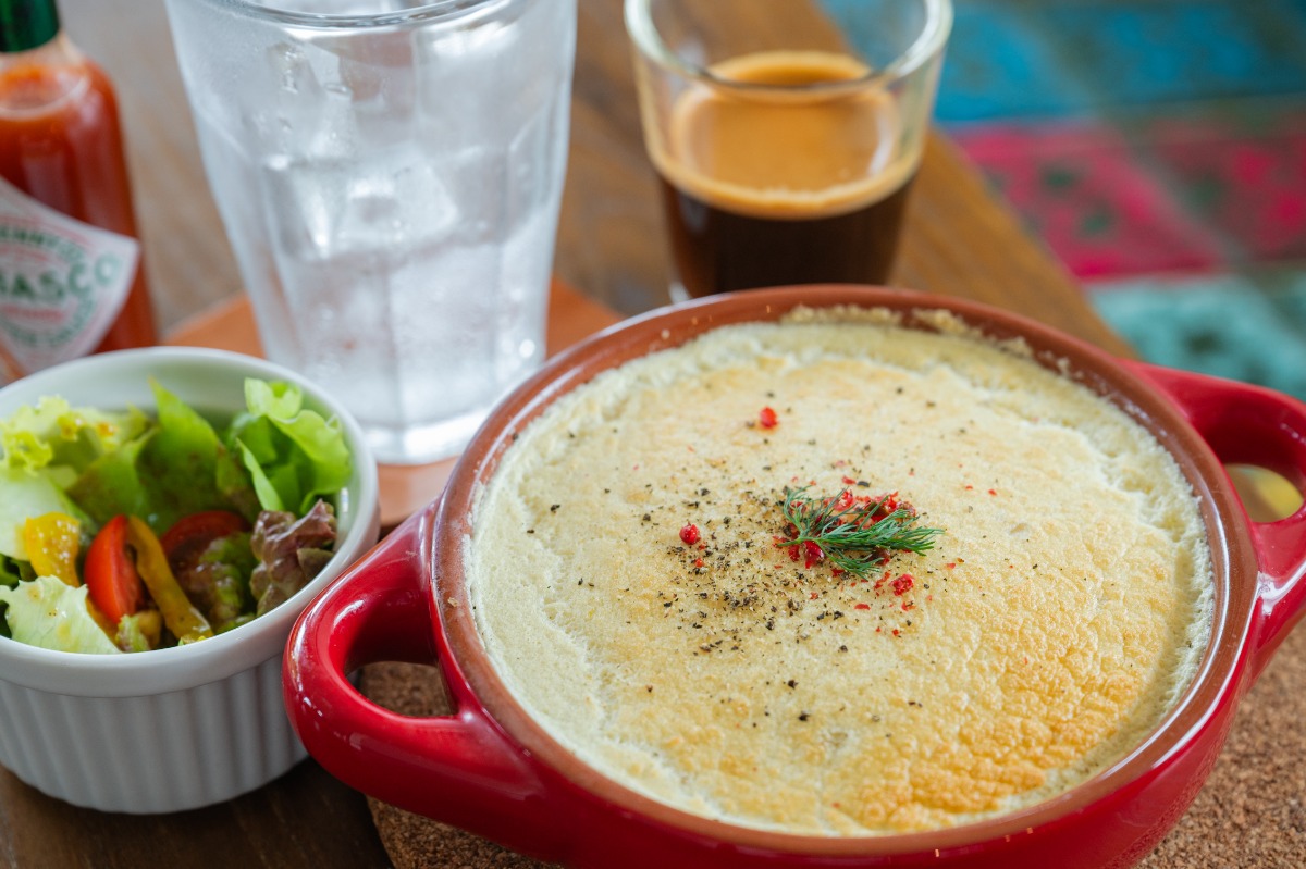 しっかり泡立てたメレンゲで作っているスフレは、口に入れた瞬間なくなってしまうほどの“ふわしゅわ”食感。芋のペーストが隠し味で、スプーンを入れるとチーズがとろ~りと出てくる絶品料理!