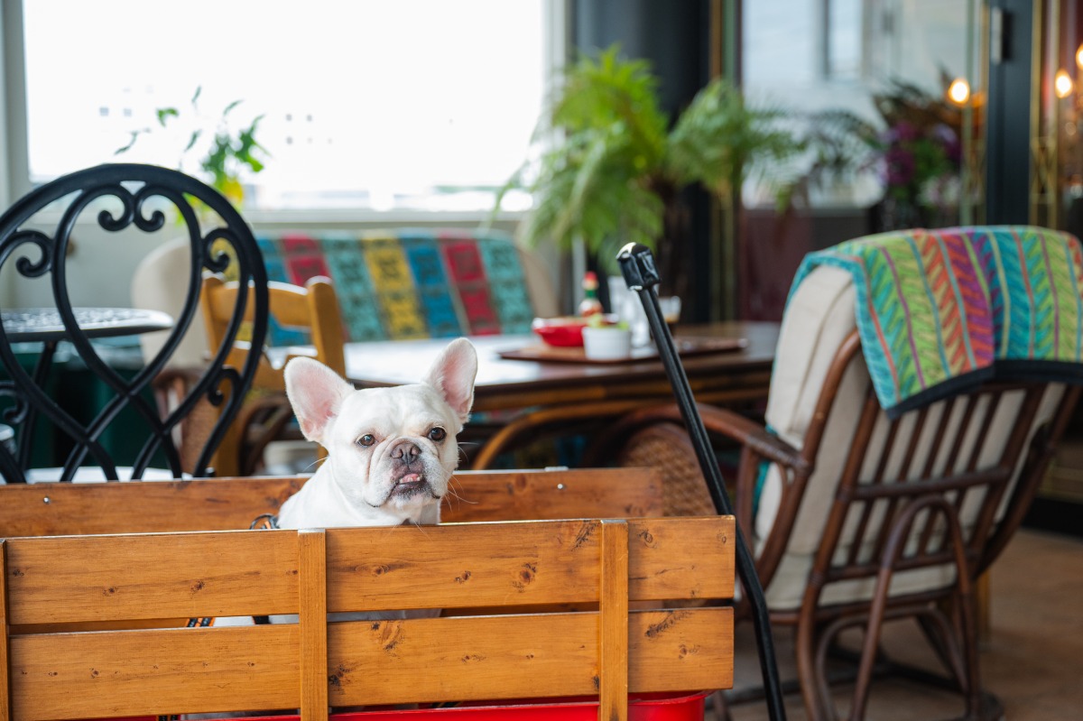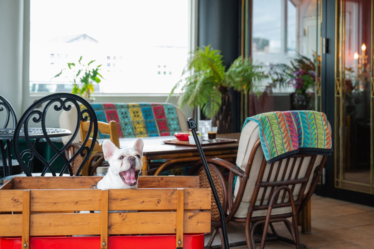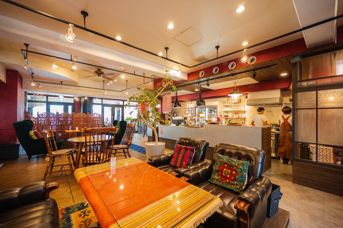 愛犬と一緒に楽しめるテラス席に加え、店内では多国籍なインテリアが楽しめます。