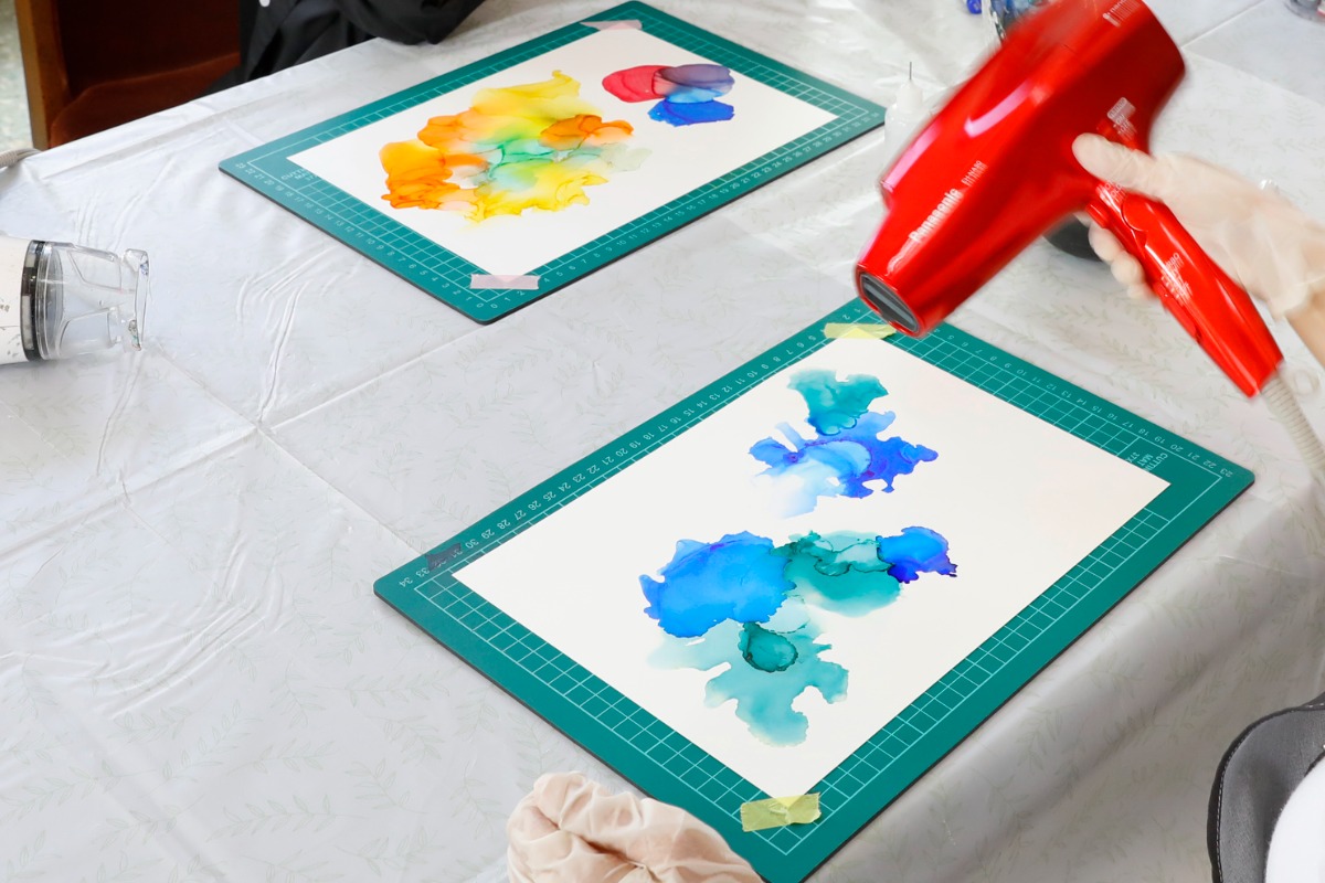ドライヤーなどの風を使ってインクとアルコールの流れと広がりを作っていきます。