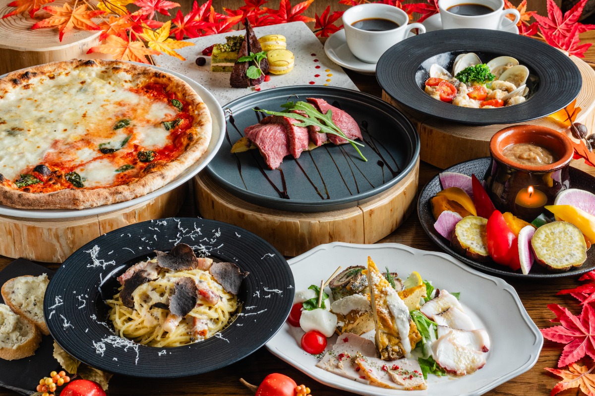 秋刀魚やきのこなど旬の食材を使った前菜や高級食材のトリュフをふんだんに使用したパスタなどを含む豪華フルコース。コース内容を詳しくご紹介します。