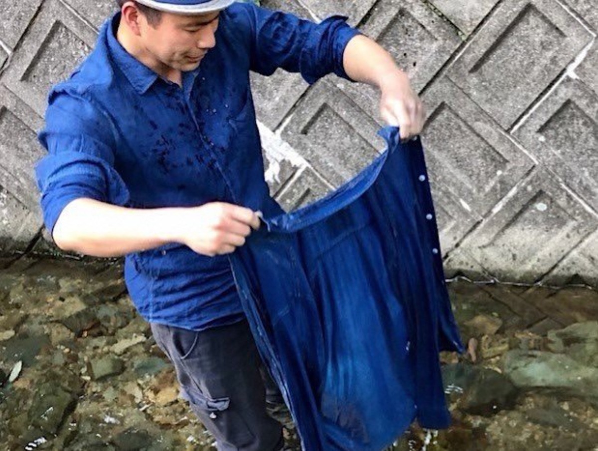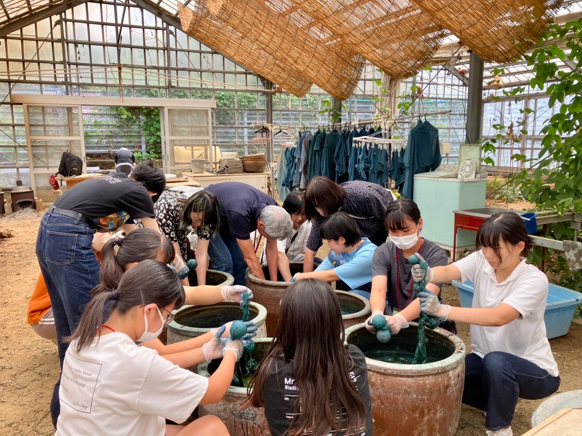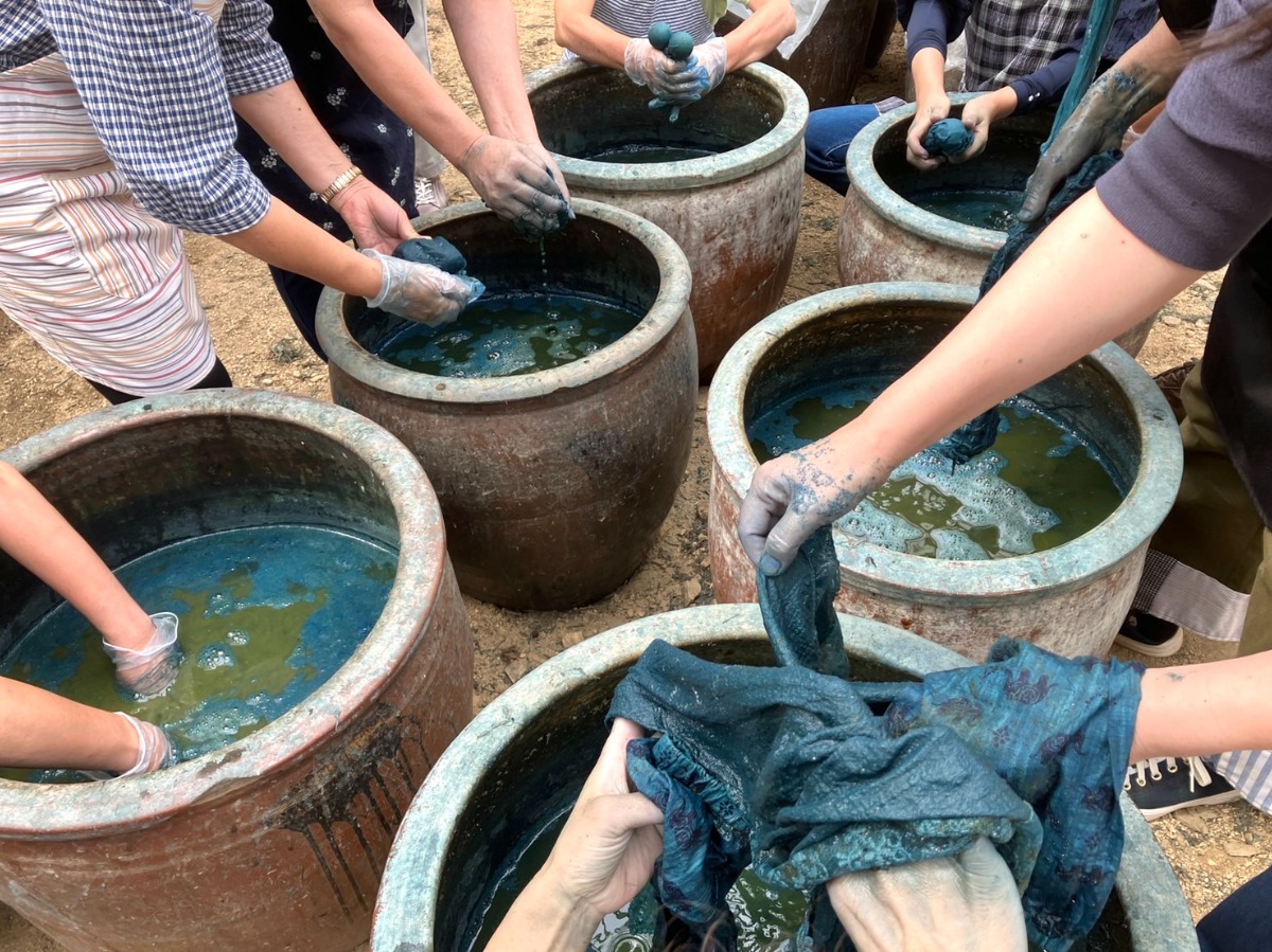 天然灰汁発酵藍染ならではの、3段階に変色しながら染まる様子を体験できます。持参した衣類の染めも可。