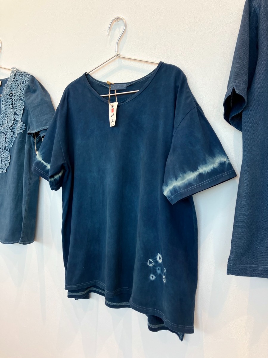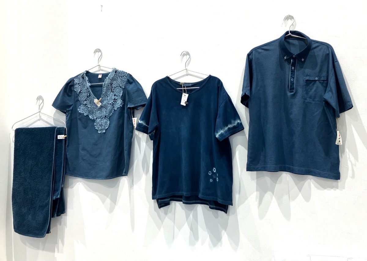 店内には、Tシャツ・ストール・ブラウスからベビー服まで幅広く取り揃い、ご自身が大事にしてきた服を持参して藍に染めてもらうことも可能。