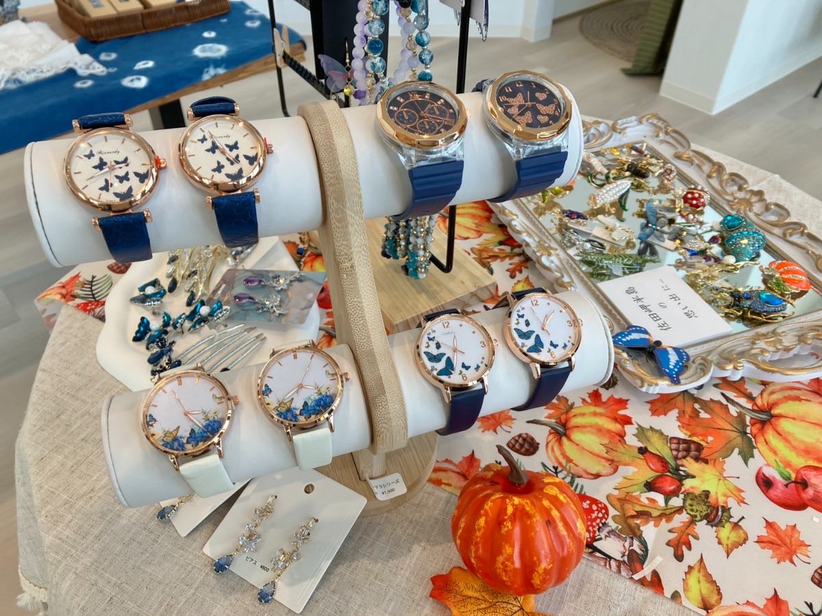 「大自然のお裾分け」がテーマの物販コーナーでは、佐田岬半島の豊かな四季を感じることができる昆虫や鳥たちのブローチや、海を渡る蝶 アサギマダラをイメージしたアクセサリー、バッグ、テーブルクロスなど様々な商品が用意されています。とても可愛く、見るだけで癒やされる商品の数々です。