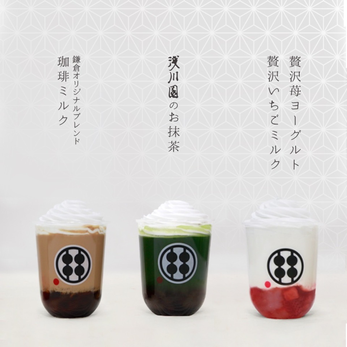 自慢の「鎌倉わらびもち」をたっぷりと使ったこだわりのわらびもちドリンク。「浅川園のお抹茶」「贅沢苺ヨーグルト」、「贅沢いちごミルク」、「珈琲ミルク」と多彩なフレーバーを楽しめ、その店のオリジナルメニューも楽しめます。