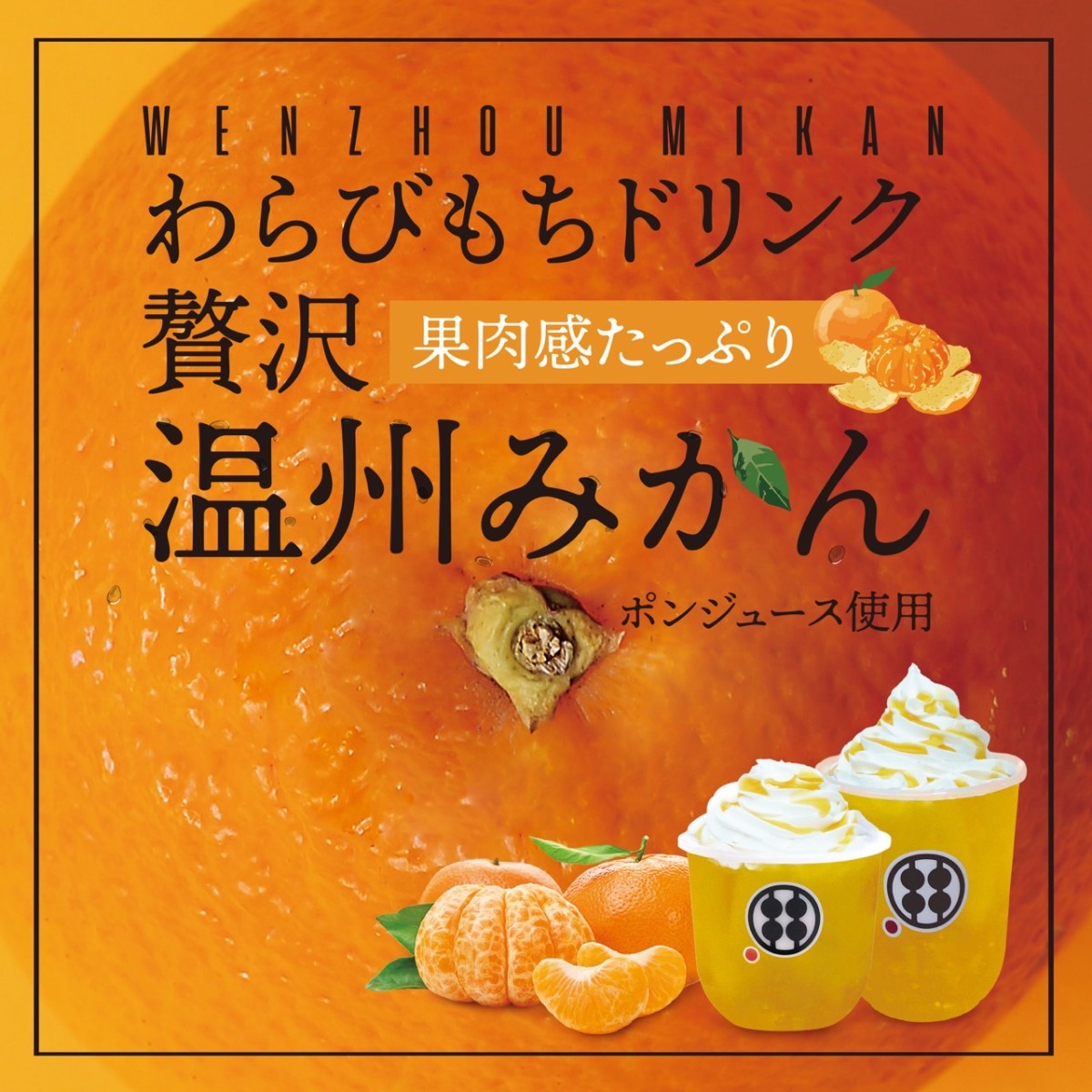 愛媛の温州みかんを使用した「わらびもちドリンク 贅沢温州みかん」は、ポンジュースの中にみかんとわらびもちが下に詰められ、上からみかんソースをかけた贅沢な一品。