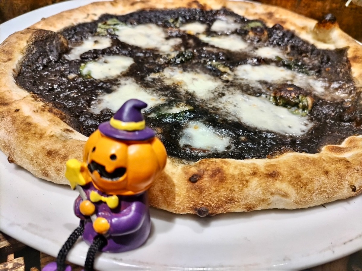 トマトソースに竹炭を混ぜた真っ黒ピッツァは、黒いのにマルゲリータだそう…!映えること間違いなしです♪