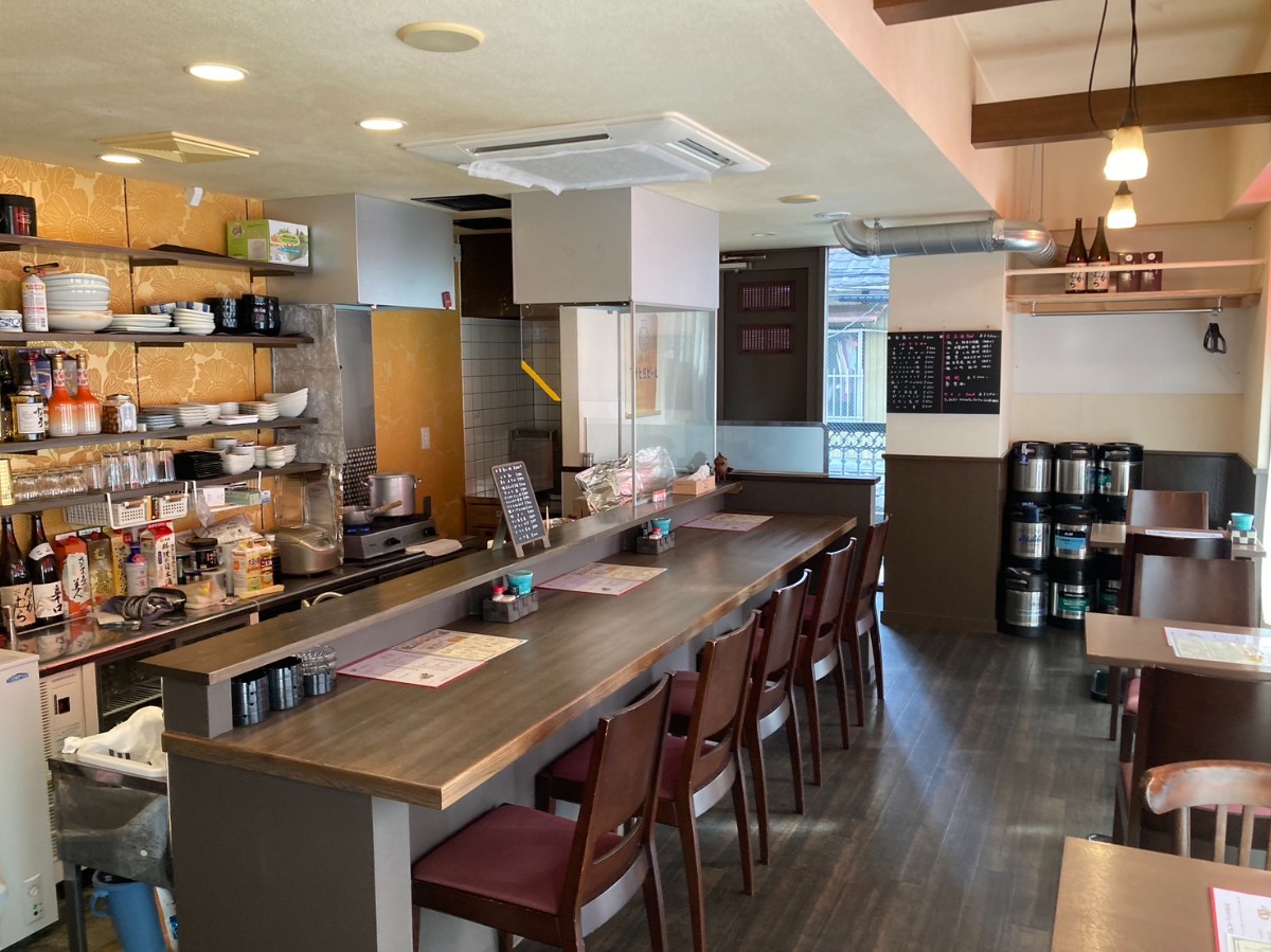 木目調で落ち着いた雰囲気の店内には、広々としたカウンター5席、4名用テーブル1席、2名用テーブル3席がある。