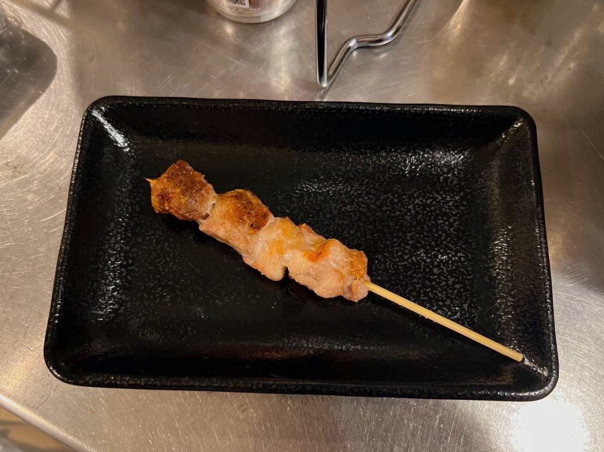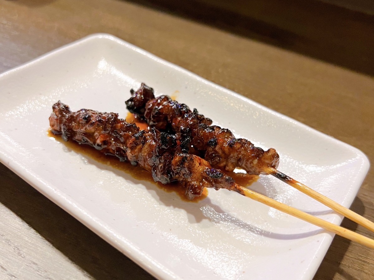 レバーと八ツの付け根の部分を使用した貴重な部位を使用した「鶏ホルモン」(250円)。1本の串を作るのに約7羽必要になるという貴重な部位を手頃価格でいただけます。ニンニクやネギが入った風味豊かな自家製のタレをたっぷり使用し肉の旨みがさらにアップ!