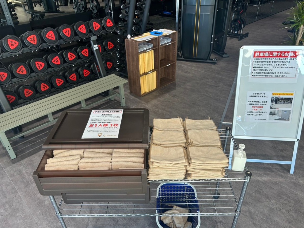 トイレやシャワー室、更衣室など1日2回の清掃に加え、マシン1台1台にアルコールを設置していて使用後は会員一人ひとりが清掃の徹底を行う仕組みになっています。