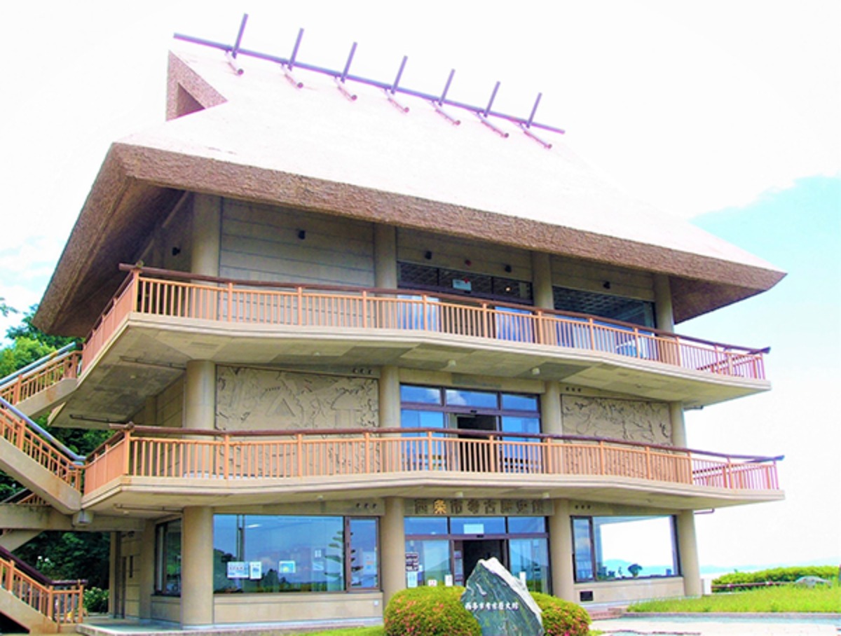 当館は、郷土の考古資料を収集展示し、もって教育及び文化の発展を図ることを目的とし、全国でも数少ない弥生時代後期の高地性集落遺跡として名の知れた八堂山(はちどうやま)の中腹に設置され、八堂山遺跡出土品を中心に西条市内の他の遺跡、古墳出土品を展示しています。3階ベランダからは、旧西条市内や道前平野・瀬戸内海の素晴らしい展望ができます。また、八堂山は市民の森として四季折々の草花等もお楽しみいただけます。