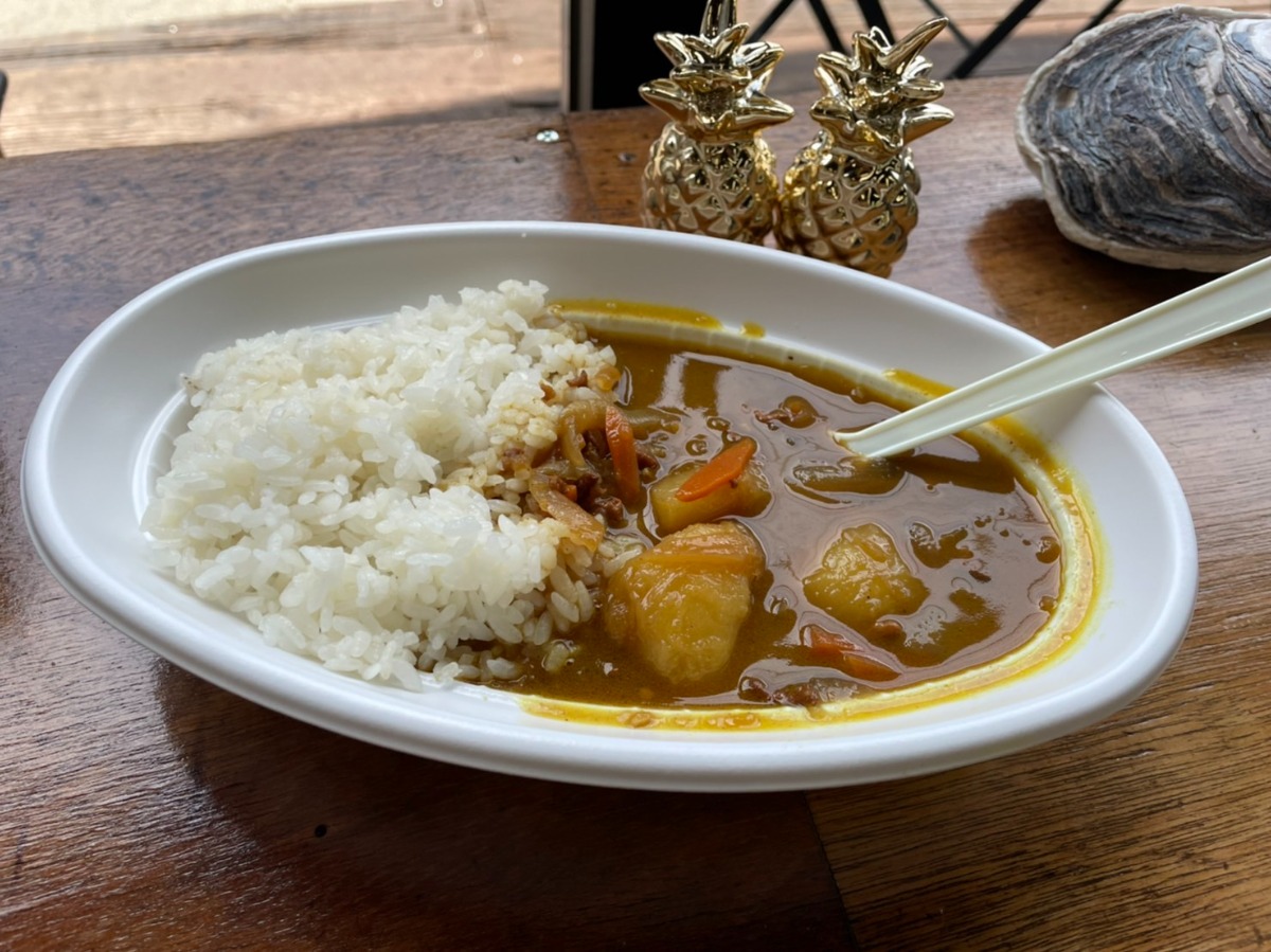 素朴で美味しいメニューが揃うイートインスペース。イチオシのカレー(486円)は、秘伝の調味料や作り方で他では味わうことができない美味しさを堪能できます。程よい辛さで、子どもから大人まで大人気! 素揚げしたじゃがいもが入っているところがポイントです! 容器にライスとルーを蓋が閉まるまで入れることができるので、食べたい量を好きなだけ調整することができますよ。もちろんテイクアウトも可能。