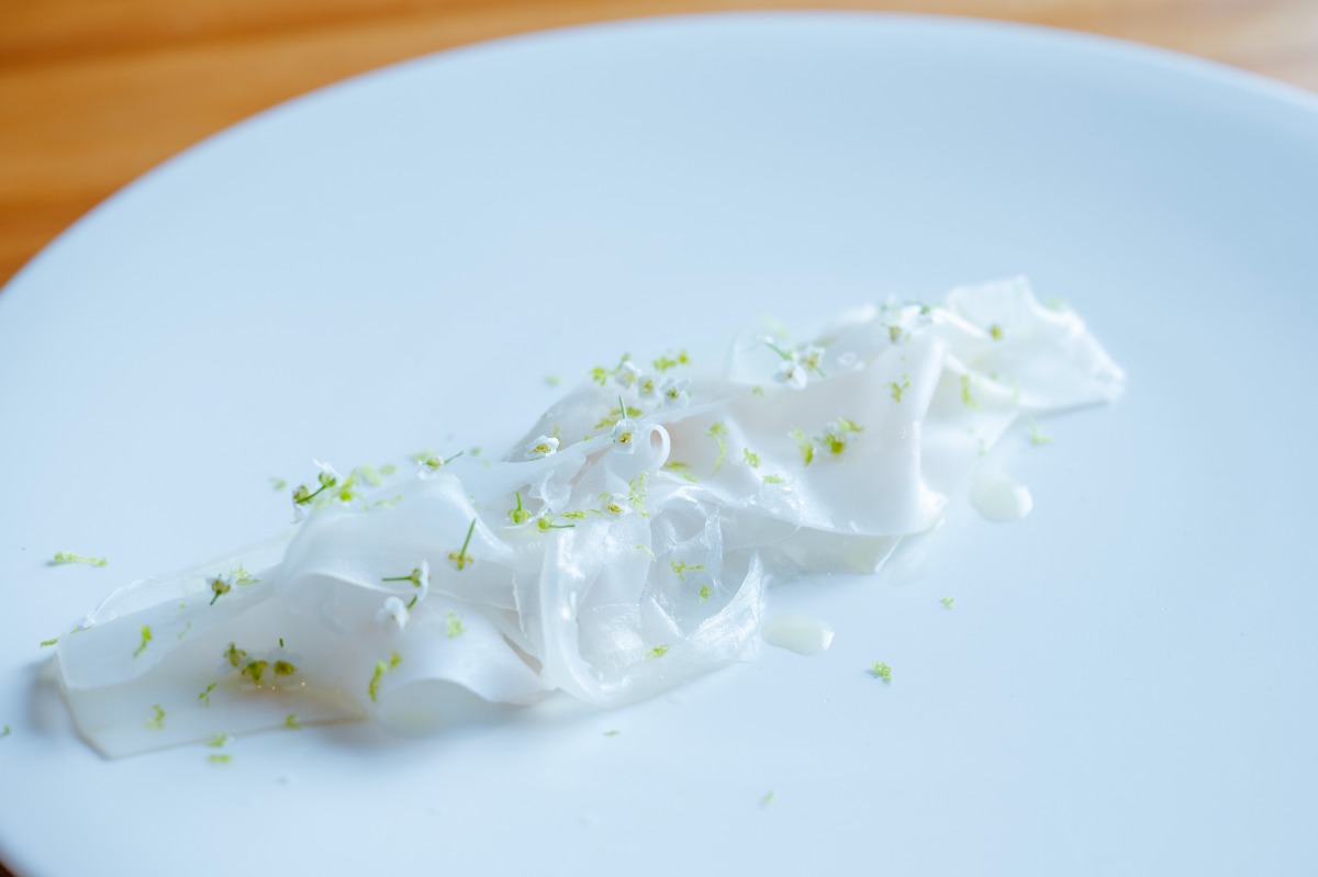 この日、頂いたのは八幡浜産の紋甲イカを使ったお料理。「ラルド」と呼ばれる豚の脂を塩漬けしたものとイカをどちらも1㎜ほどにスライスして重ね、両⽅の旨みが合わさりワインが進む⼀⽫。