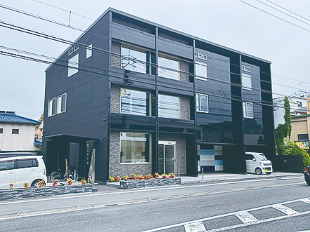 空港通り沿いの黒い建物が本社社屋。業務拡大のため、2023年高松営業所を開設