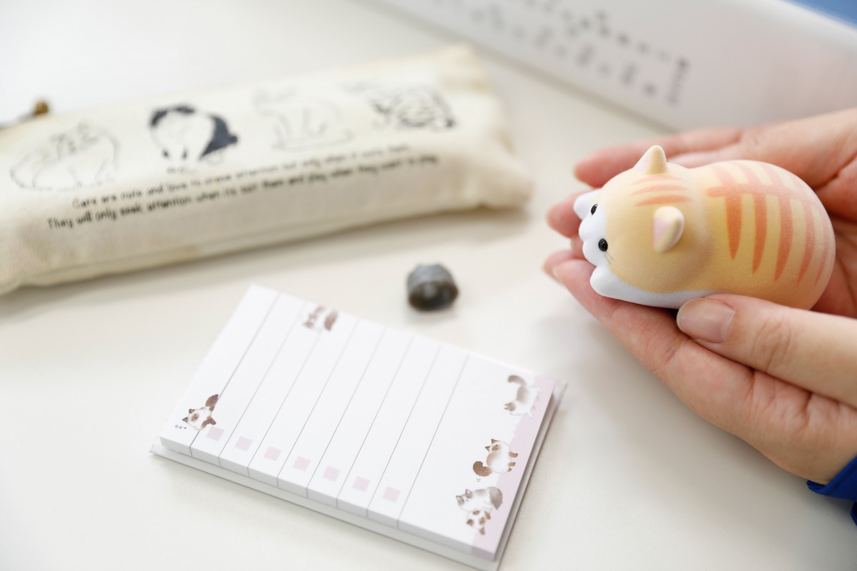 事務作業が主な業務なので、自分が好きな猫のモチーフが入った文房具を使ってやる気をアップしています。