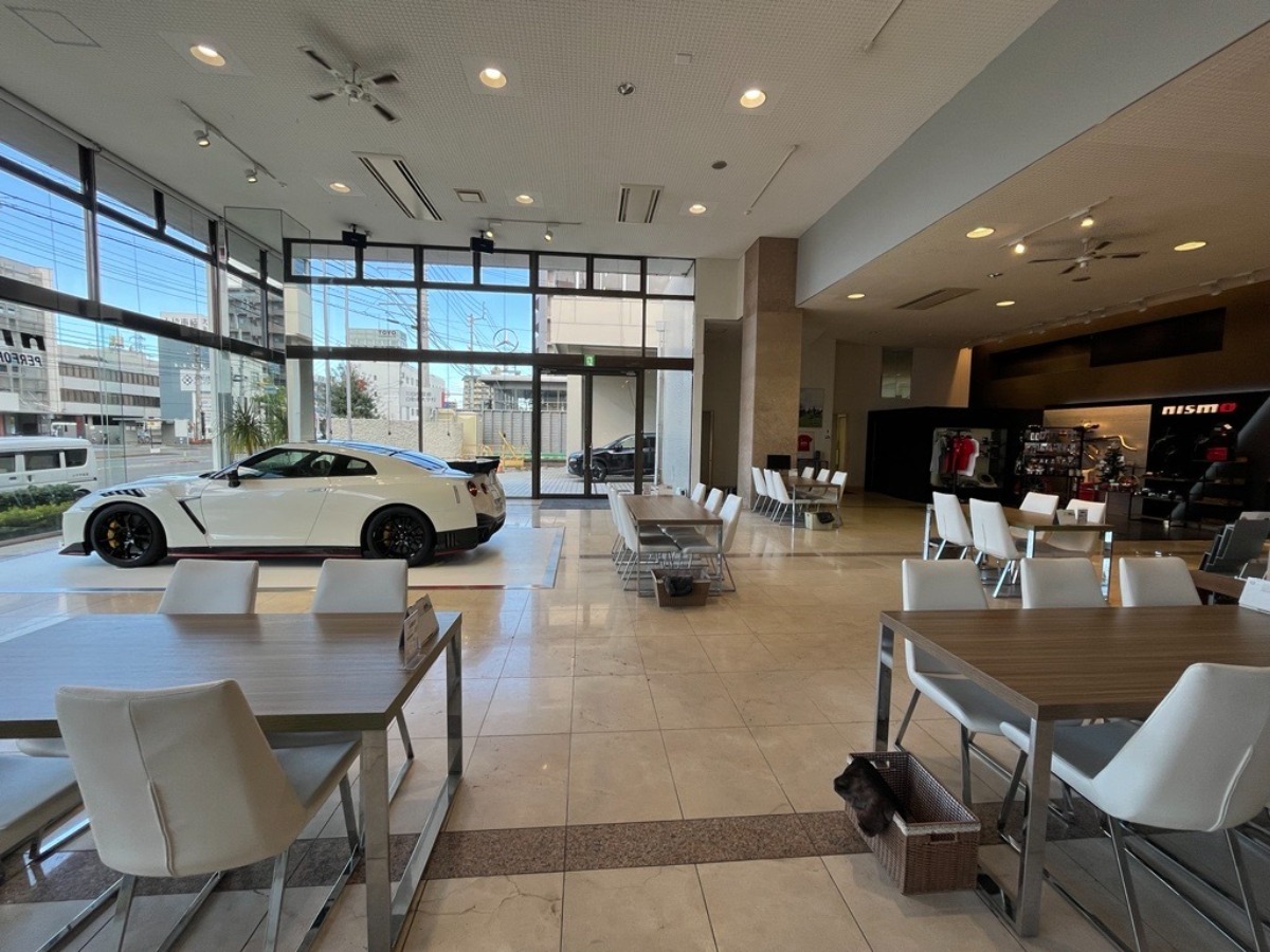 宮西店の店内は、白を基調とした明るいショー ルームで、人気車種の展示もしている
