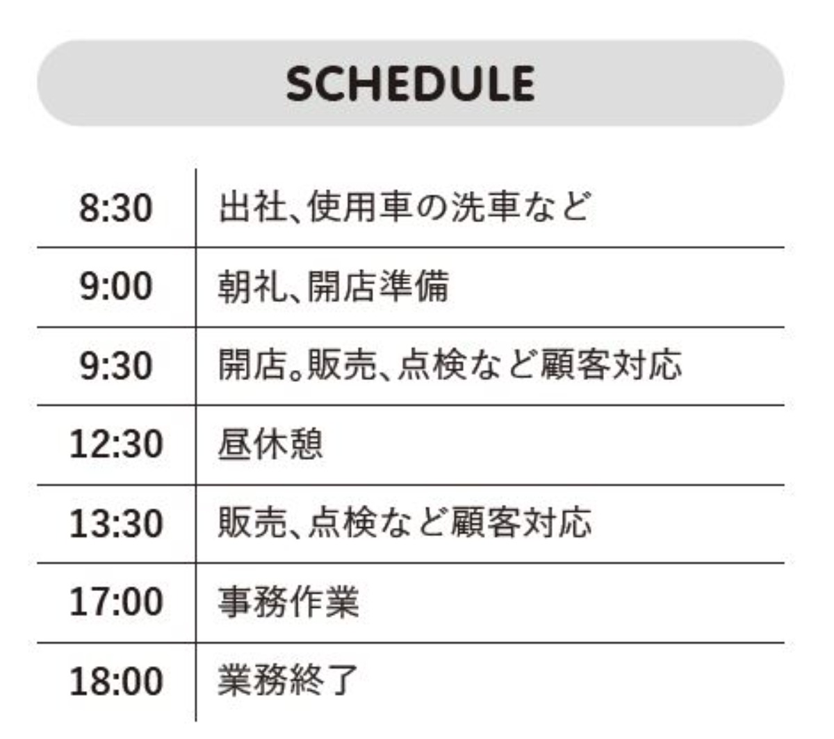 ●休日休暇/年間休日100日、月曜・第2火曜定休、GW休暇、夏季休暇、年末年始休暇、有給休暇、忌引休暇、結婚休暇、産前産後休暇、育児休暇、子の看護休暇、介護休暇他