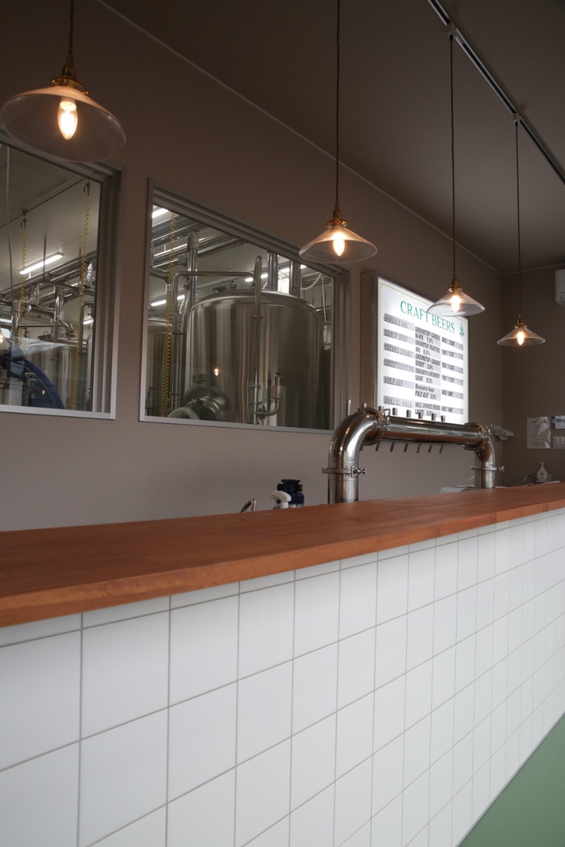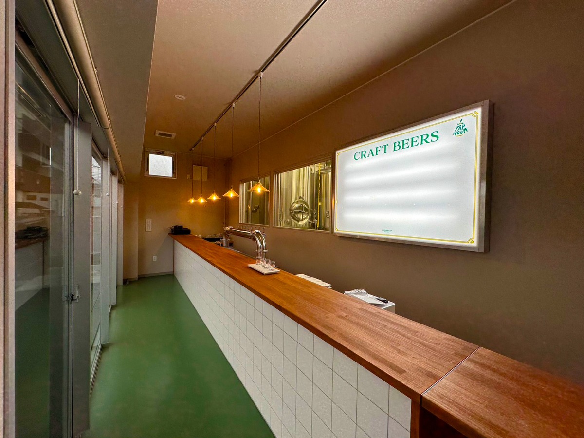 窓の向こうのビール工場を見ながら、カウンター席でクラフトビールを堪能できます。天気のいい日は外のテラス席で過ごすのもキモチがいいですよ!