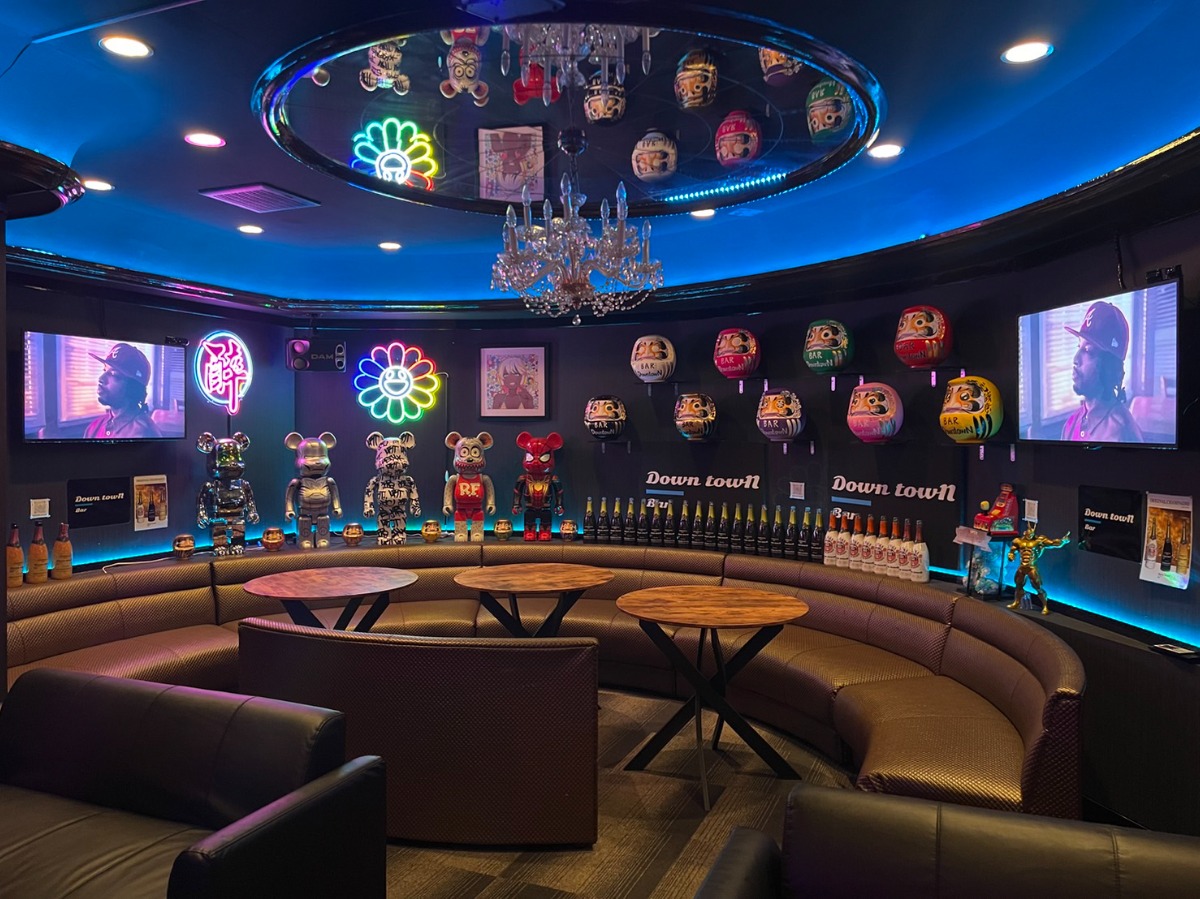 本当に日本?と聞きたくなるような派手やかな店内。世界的に有名なキャラクター ベアブリックの巨大フィギュアが5体いたり、モニターが7台設置されPV映像が流れていたり、垢抜けた都会風のネオンが眩しかったり。。