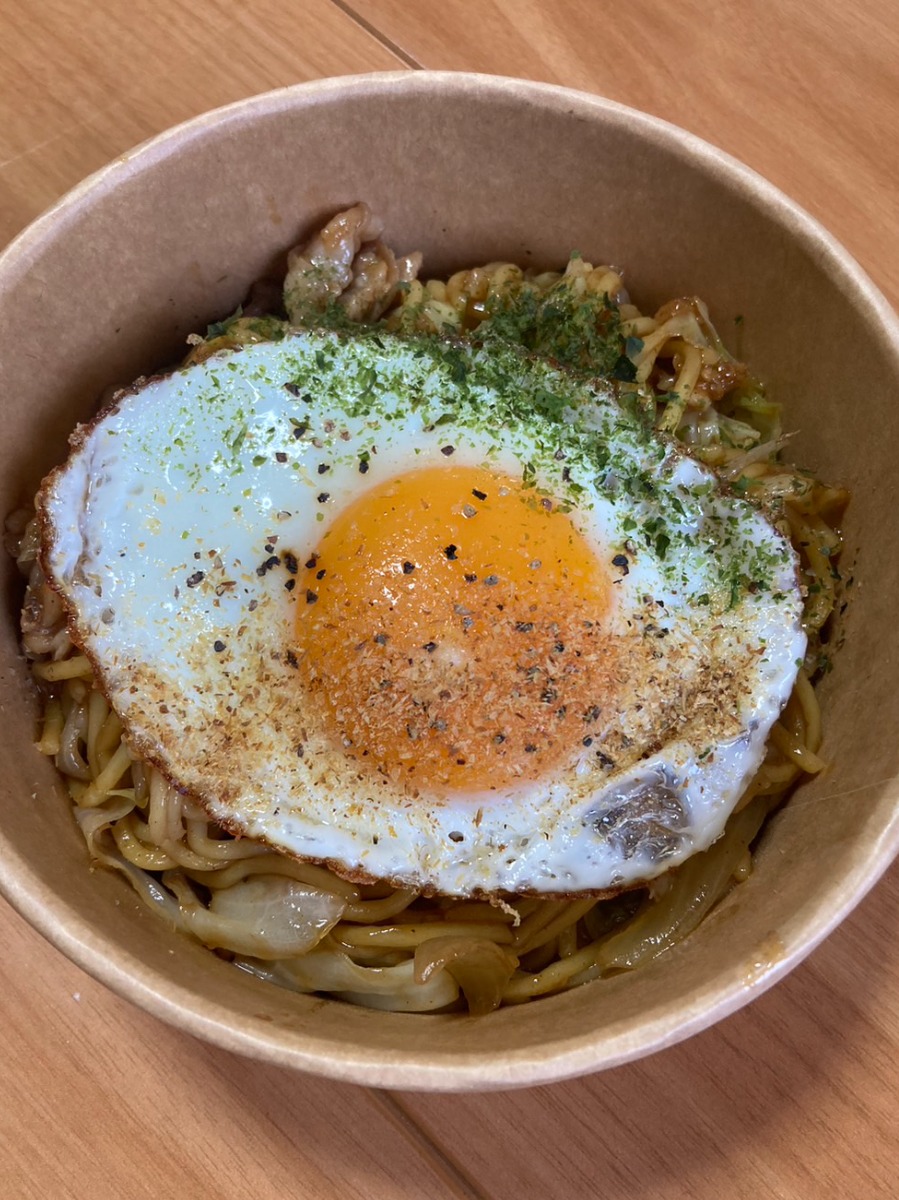 また、焼そば(500円)も同じ材料を使って調理されていて、上に目玉焼きがのった贅沢なメニューになっています。