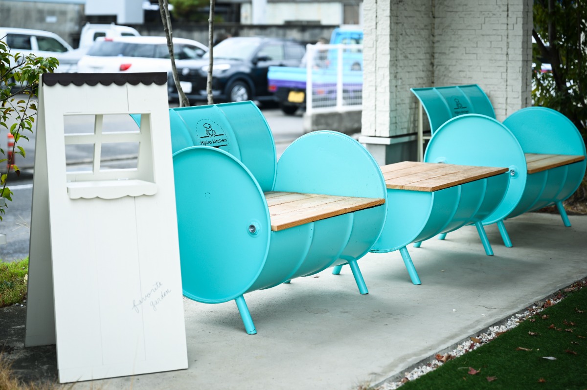 イートインスペースには店主お気に入りのティファニーブルーのお洒落なドラム缶のインテリア。