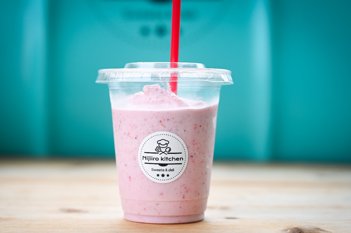 愛媛県産のイチゴを冷凍し、牛乳と自家製のイチゴシロップを使って作るスムージーは、フルーツサンドと一緒にテイクアウトする人が続出!!