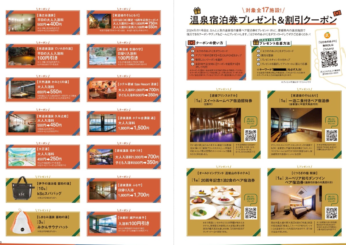 人気の温泉宿の豪華ペア宿泊券や、愛媛県内の温浴施設で使用できるクーポンやグッズもど~んとプレゼントします‼
