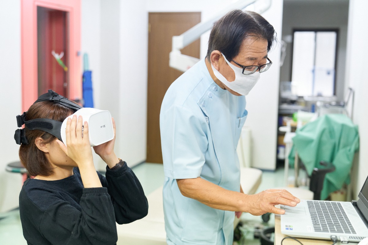 次は、めまいと末梢前庭系の関連があるかを確かめるvHIT(ビデオヘッドインパルス検査)という検査です。聴力検査や重心動揺計検査に加わる形で、こちらの検査も2022年の診療報酬改定による保険適用となったそうです。検査は、専用のゴーグルを付け、先生やシステムの指示に従って赤や緑の点を目で追うだけ。「検査中も、表示される画面に酔ったり気分が悪くなったりした場合は遠慮なく伝えてくださいね」とのことでした。