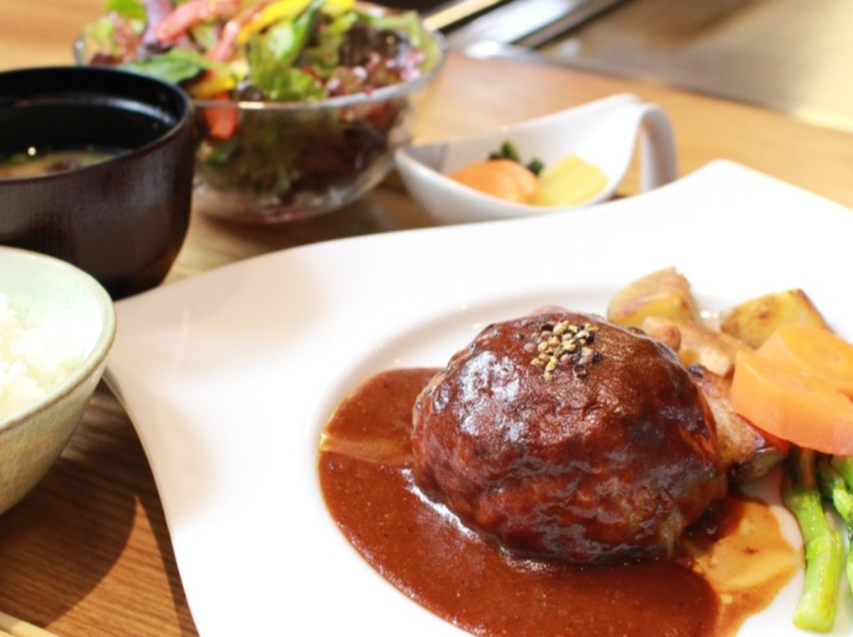 カフェのイチオシは、手作りのハンバーグが自慢の「ハンバーグランチ」。「パスタランチ」や「牛すじカレーセット」もあり。これら3種のランチは食後にプチデザートとコーヒー、もしくは紅茶付き。