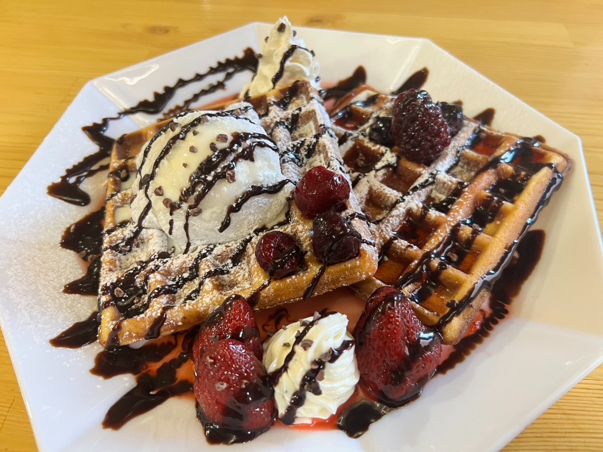 ワッフルの上にはクリームチーズホイップ・生クリームホイップがのっていて、さらにその上にカカオニブがオン。