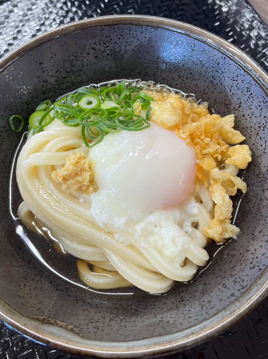 つるつる麺にまろやかな温泉玉子が絡まったほんのり甘いぶっかけうどん。サッと食べることができるので、忙しいときにぴったりです。