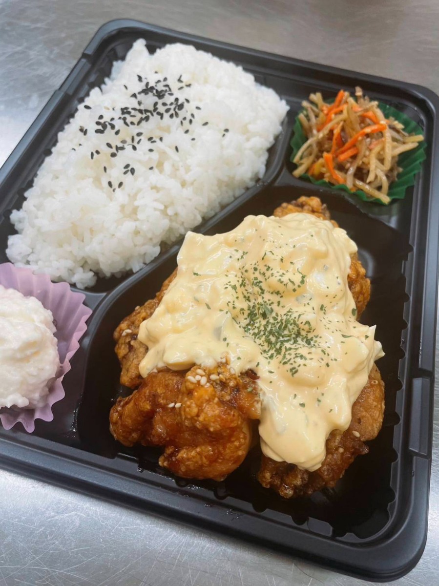 甘酢をかけたもも肉の上から特製タルタルソースをかけたチキン南蛮に、2種の副菜とごはんが入ったボリューミーな内容です。