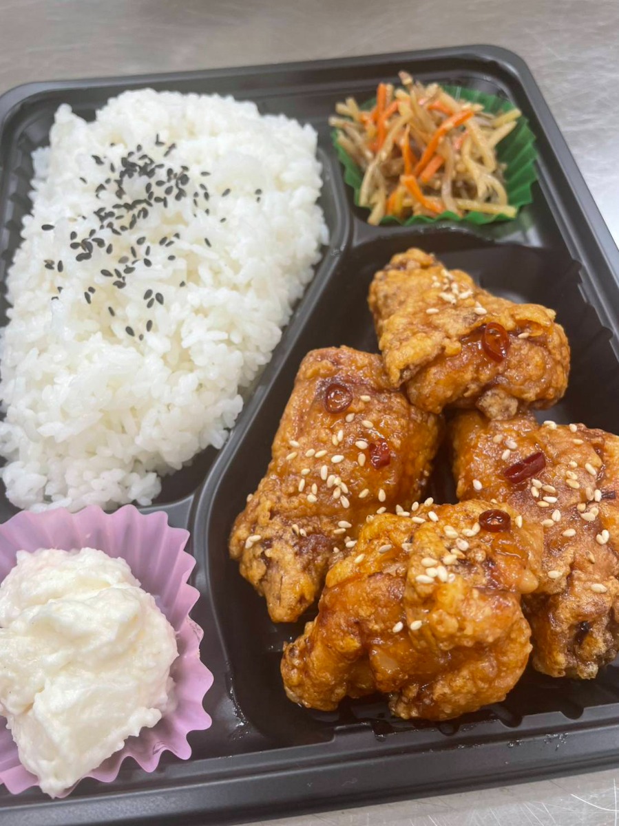鷹の爪が入ってちょっぴり刺激のある「鳥甘酢弁当」。甘辛い味付けでクセになる、満足度の高い弁当です。