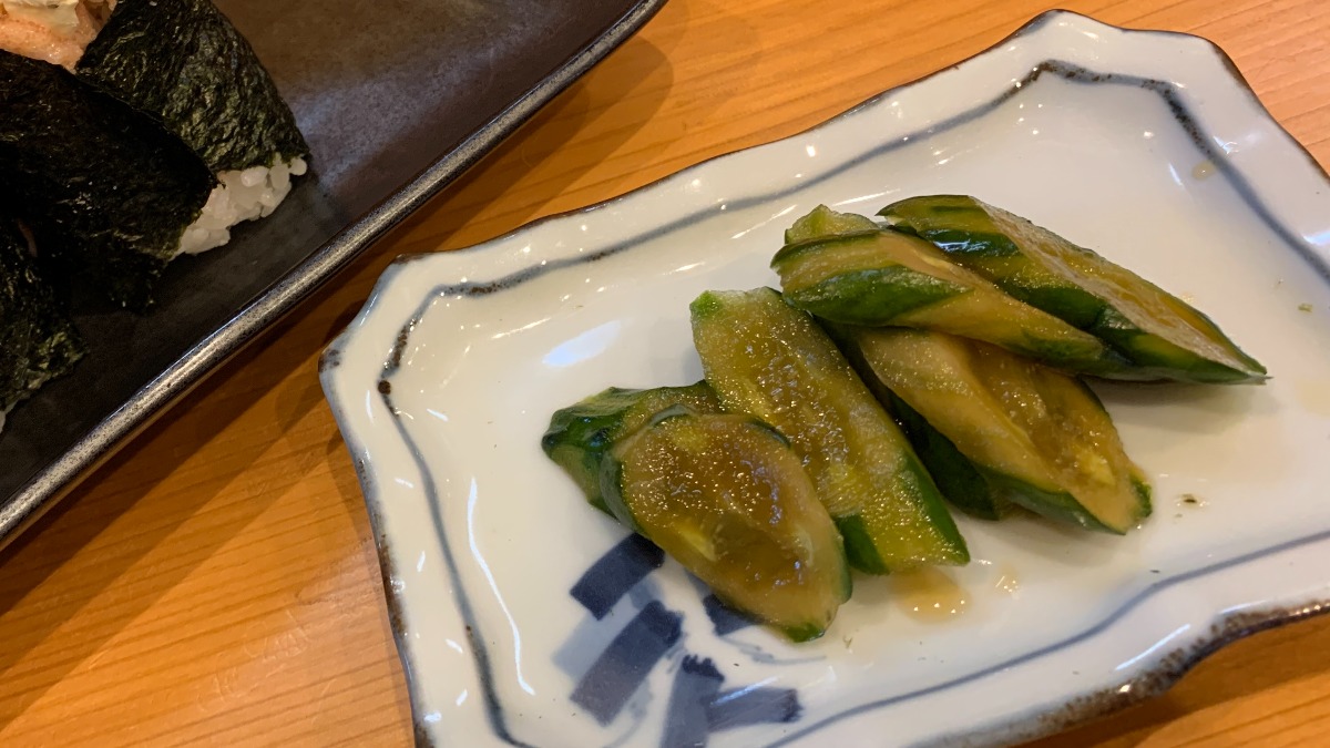 ぜひ、おにぎりと一緒に食べてほしい、サイドメニュー。 「きゅうりの漬物」は、その濃い味に箸が止まらない!! 無限に食べれてしまいそう。