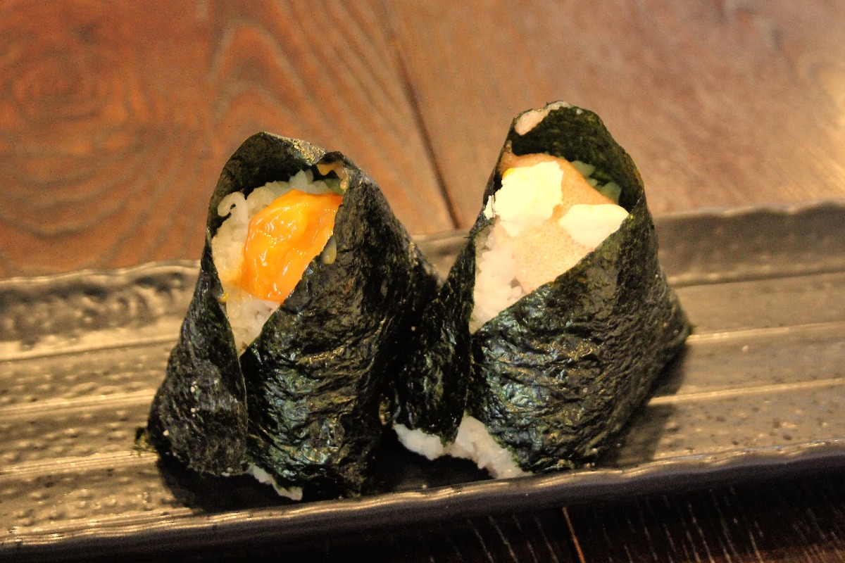 塩加減が絶妙で端までたっぷり具が入っており、さらに一つひとつのサイズが大きいため、満足感も高い。中でも醤油に漬けた卵黄が美味しい「卵黄しょうゆ」や、少しピリッとした明太子とまろやかなクリームチーズが相性抜群の「明太子クリームチーズ」が人気。