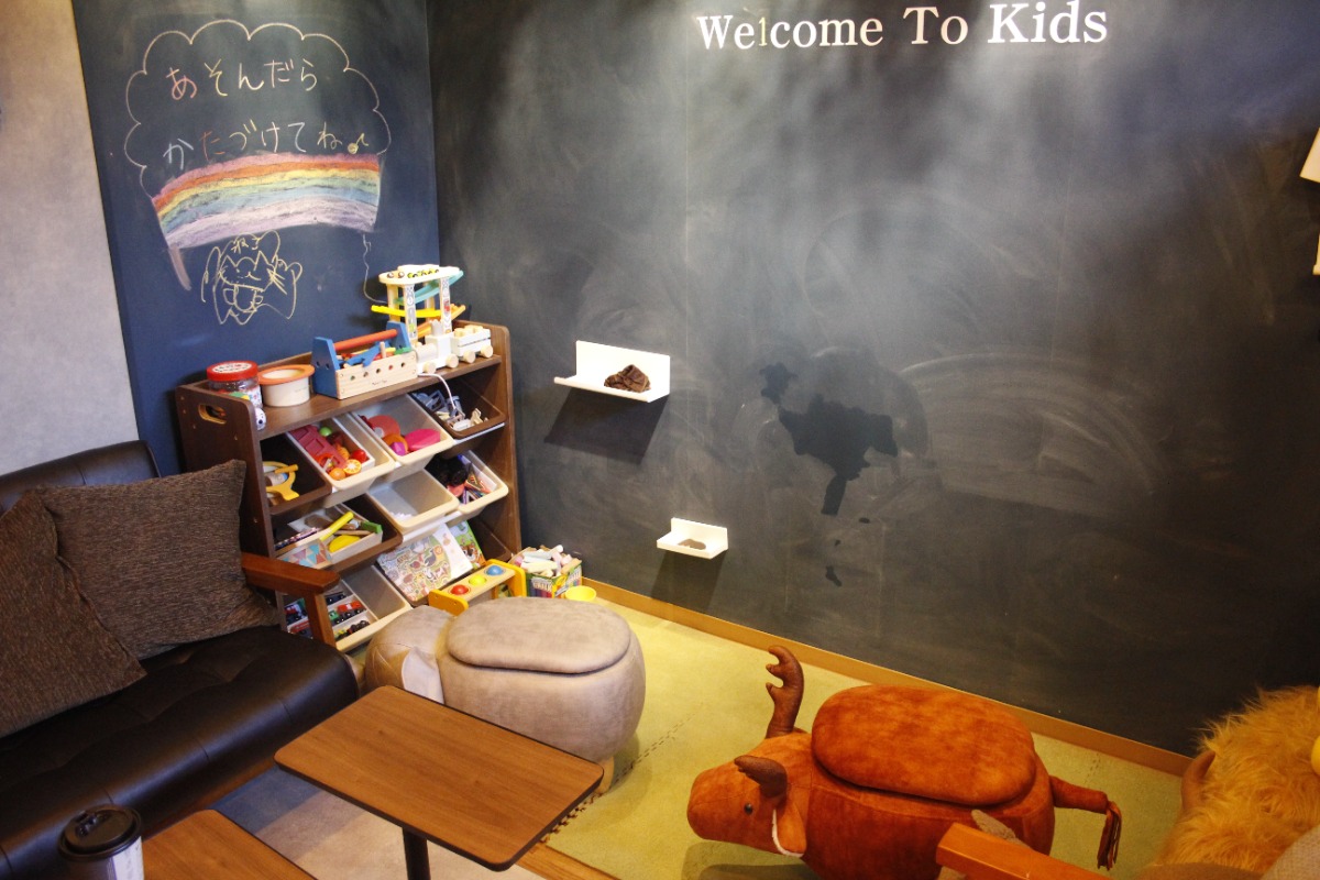 子どもも楽しんでほしいとキッズスペースが用意されている。黒板で絵をかいたりおもちゃで遊んだりと充実した時間を過ごせるようになっている。
