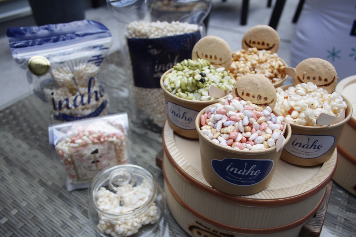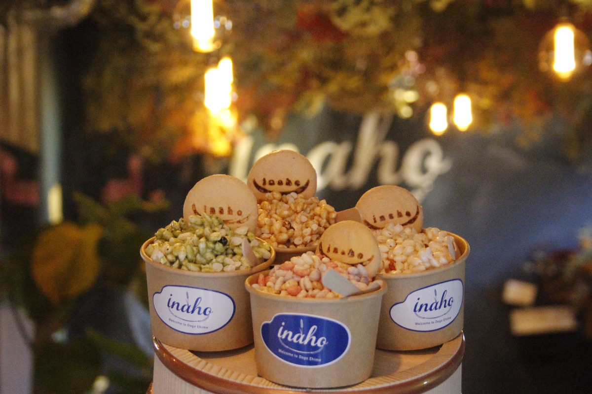 ポン菓子は結婚式の引き出物にされることもある“幸せの象徴”! inahoは、1階でポン菓子を製造・販売しており、2階はテラス席もあるイートインスペースなのでカフェのような使い方もできる。「mobydicks tea」のドリンクも楽しめる。道後散策の休息に足を運んでみて。
