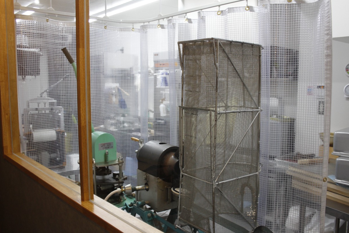 店の奥にあるガラス張りで見やすいポン菓子工房。運が良ければ「ドンッ!」というポン菓子ができる音が聞けるかも!米は、愛媛県西予市野村町のものを使用。野村町は四国の山脈に囲まれた肱川の上流域で、安心安全にもこだわって厳選している。