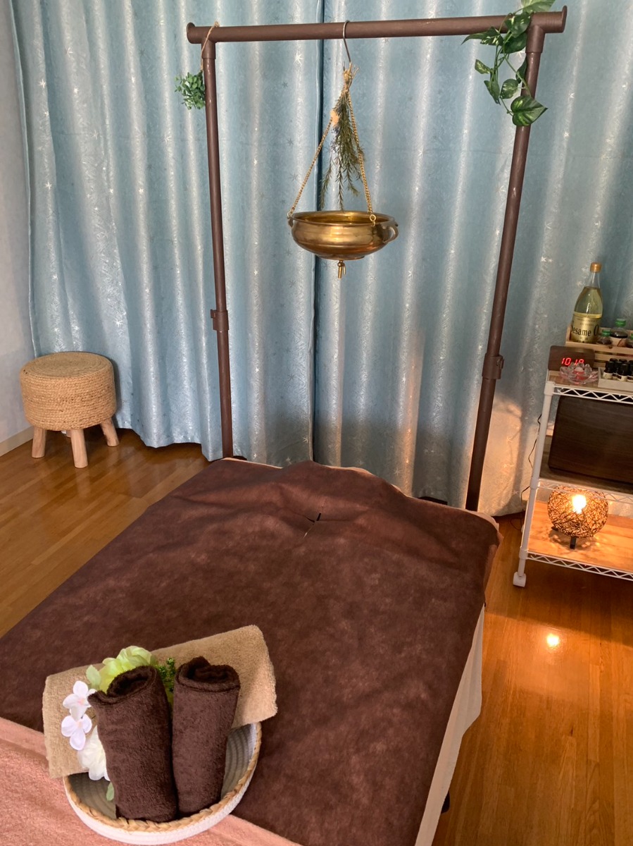 東雲町にある女性専用完全プライベートサロン。心身のリフレッシュに繋がる天然薬草オイル100%を使った本格的なアーユルヴェーダ施術と全身にハーブスチームを浴び、身体を芯から温める「葉マム浴」が人気です。身体の不調改善にはオールハンドの「アロマトリートメント」もおすすめ!