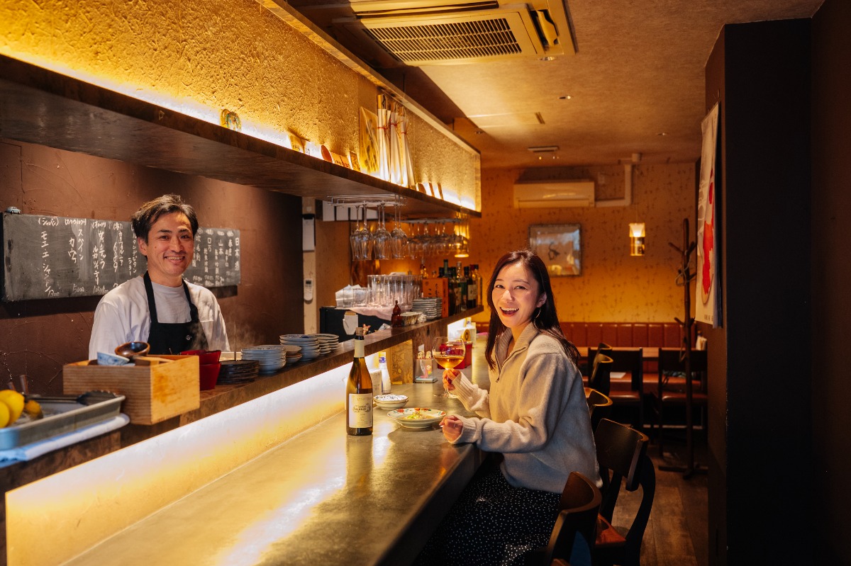 今回は「合鴨のおでん」を頂きました。合鴨を一度ローストして、皮目を炭火で焼いているので、香ばしい!そして、この一品にナチュール(自然派)のオレンジワインがよく合うのです。紅茶のような風味も感じる穏やかな味わいの一杯で、おでんの滋味を引き立てます。