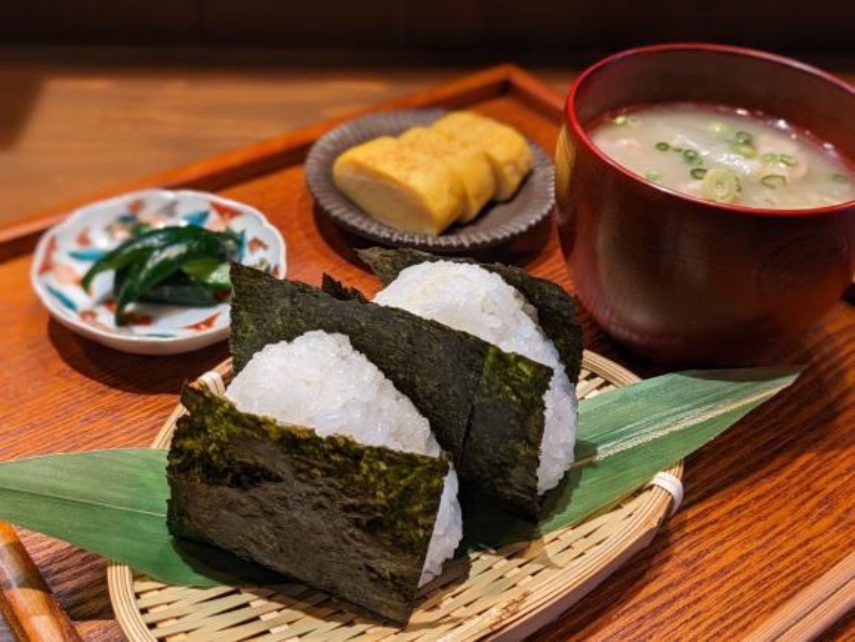 炊きたてのおにぎりが食べられるカウンター席では、汁物と漬物、玉子焼きがセットになった定食を提供!