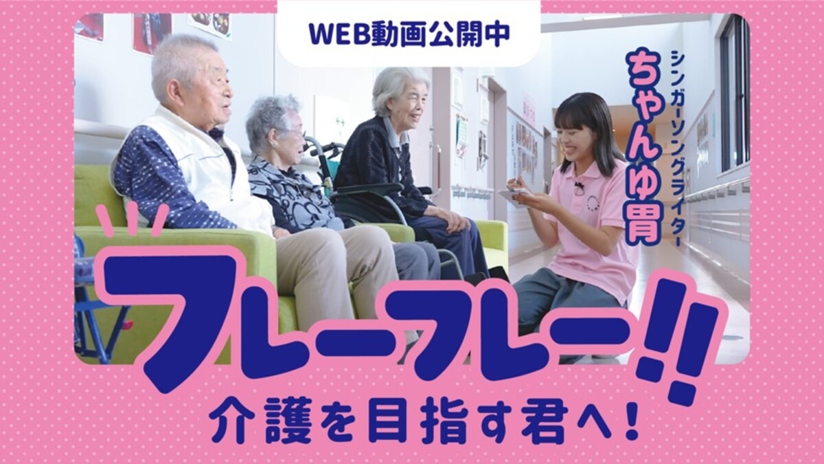 TikTokなどで若者に絶大な人気を誇る愛媛県出身のシンガーソングライター「ちゃんゆ胃」が出演し、介護職を志す学生たちや、介護現場で働く方々と一緒に学んだり、体験したり。