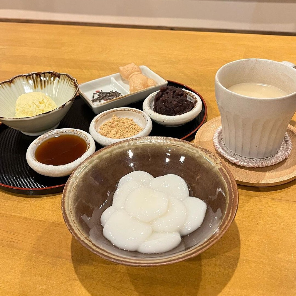 自家製白玉10個、味3種(みたらし、きなこ、自家製粒あん)、選べるアイスクリーム(バニラ、抹茶、黒ごま、ほうじ茶、糀甘酒)、猫モナカ、塩昆布、ドリンクがセットになった贅沢なメニュー!