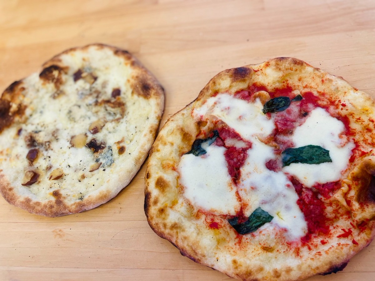 「マルゲリータ」や「4種のチーズピザ」など、生地から作ったピザも並んでいます。「4種のチーズピザ」は、モッツアレラ・ゴルゴンゾーラ・グラナパダーノ・スモークのチーズを使用し、はちみつをかけて食べると一段と美味しさアップ! 店内にはフォカッチャもありますよ。