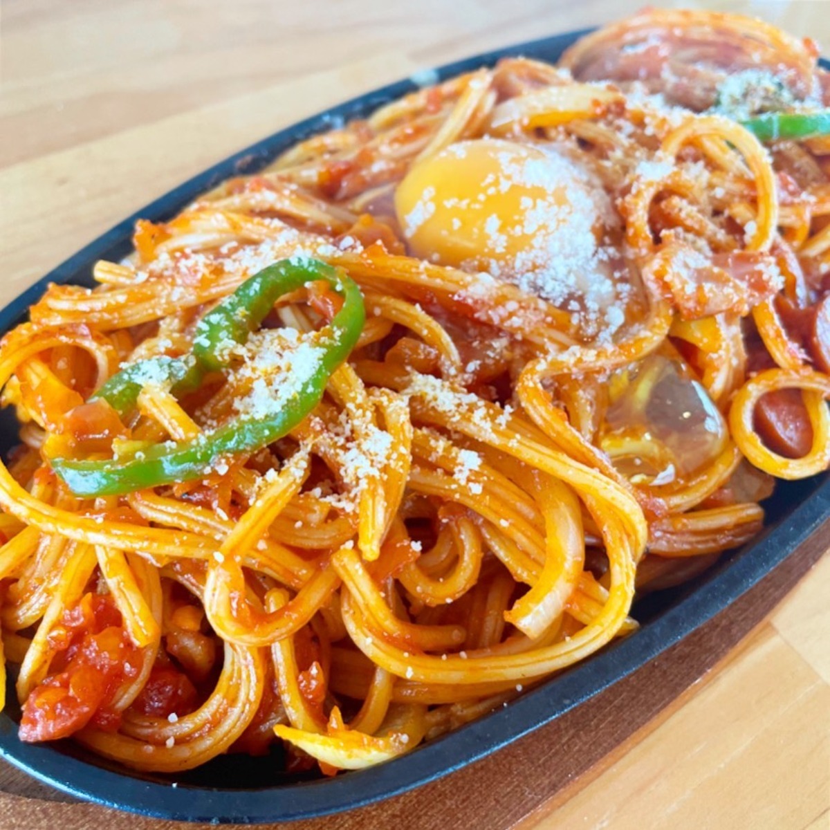 モチモチの太麺を使用し、熱々の鉄板で提供されるナポリタン。タマネギ、ピーマンなど全て地元産の食材を使用し、毎日コトコトと作る自家製ソースは、昔食べた懐かしい味と大好評。上に乗った生卵に絡めて、熱いうちに食べてくださいね!
