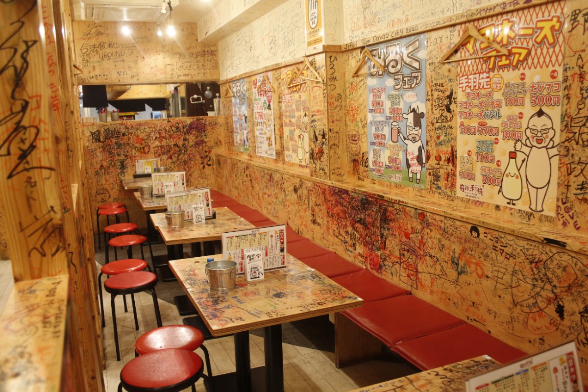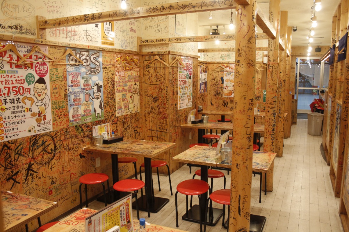 テーブル席は通常4人掛けだが、テーブルを移動させられるので、大人数にも対応可能。会社宴会や女子会、家族での来店にもぴったり!一人での利用がしやすいカウンター席もあり。そしてなんと店内の壁は落書き自由!その日の思い出を書き残してみては。