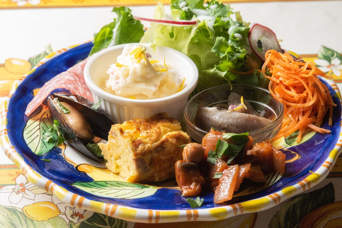 フリッタータやポテトサラダ、ムール貝の白ワイン蒸し、イワシのマリネなど、その日の仕入れによって内容は異なる