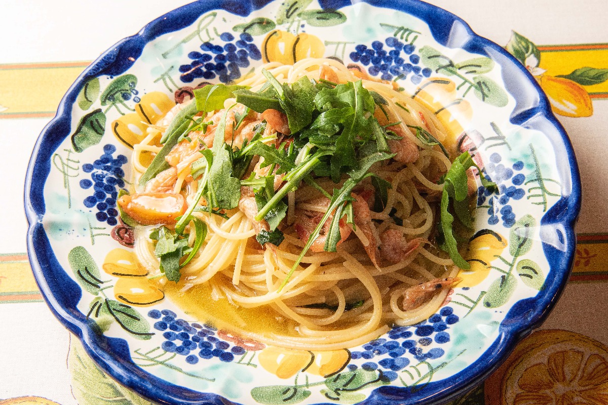 今治産のエビを使い、トマトとシェフが自ら有機栽培したルッコラを和えたパスタ。